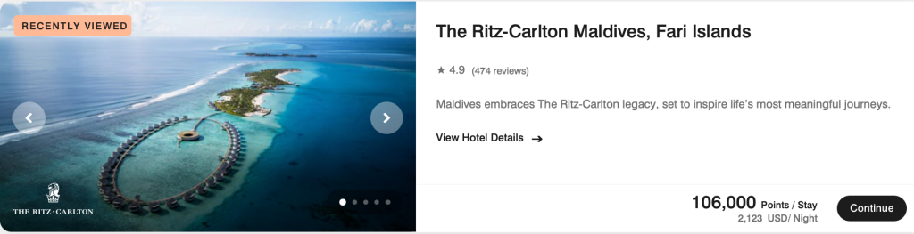 The Ritz-Carton Maldives, Fari Islands: RM9570 / 106000 points = 9.0 CPP
