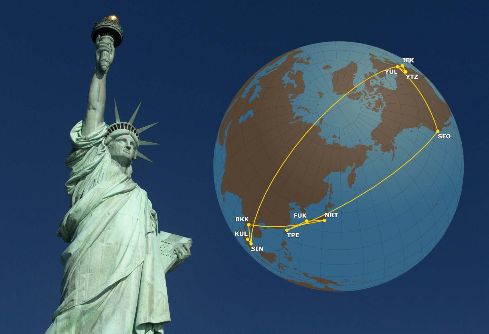 Route summary : Kuala Lumpur (KUL) – Singapore (SIN) – New York (JFK) – Toronto (YYZ) – Montreal (YUL) – San Francisco (SFO) – Taipei (TPE) – Fukuoka (FUK) – Tokyo (NRT) – Bangkok (BKK) – Singapore (SIN)